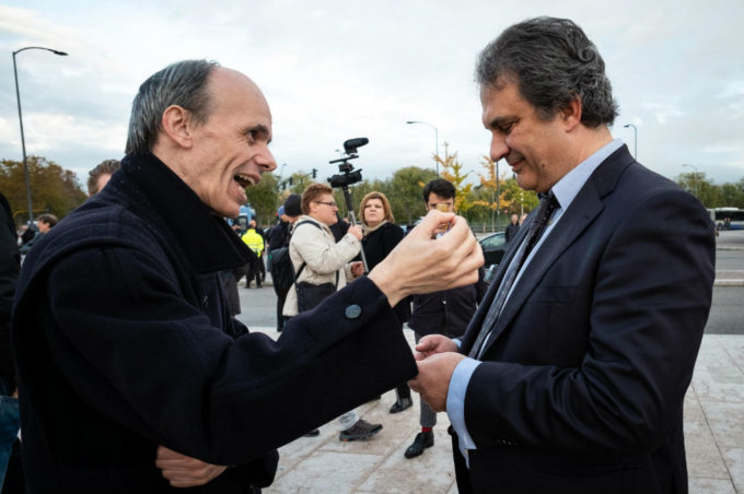 Il presidente del comitato No194 Pietro Guerini (a sinistra) con il presidente di Forza Nuova Roberto Fiore (a destra) prima dell’inizio del corteo contro l’aborto a Verona, il 24 novembre. (ANSA / CLAUDIO MARTINELLI – FILIPPO VENEZIA)