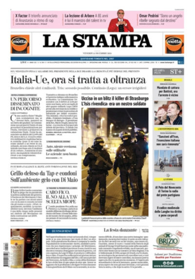 Per la maggior parte dei giornali di oggi la notizia in apertura è ancora la trattativa fra il governo italiano e l’Unione Europea sulle modifiche da apportare alla manovra economica per evitare la procedura di infrazione. Il Corriere della Sera titola sull’uccisione dell’attentatore di Strasburgo ieri sera durante un’operazione di polizia, il Manifesto e Avvenire aprono sulla sentenza del tribunale di Milano che ha condannato il comune di Lodi a modificare il regolamento per l’accesso ai servizi di mensa scolastica, ritenuto discriminatorio, il Giornale è preoccupato per l’approvazione del decreto fiscale e delle nuove norme anti corruzione, e i giornali sportivi si occupano dell’eliminazione del Milan dall’Europa League dopo la sconfitta con l’Olympiacos.
