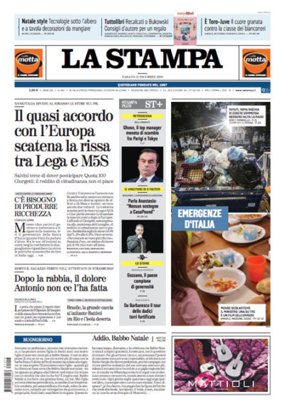 I giornali di oggi si occupano in apertura di notizie diverse: alcuni titolano sulle nuove tensioni nella maggioranza sulle modifiche da apportare alla manovra economica per andare incontro alle richieste dell’Unione Europea, dopo le dichiarazioni del sottosegretario leghista alla presidenza del Consiglio Giorgetti contrario al reddito di cittadinanza, altri aprono sui risultati delle ispezioni dei NAS nelle mense scolastiche presentati ieri. Avvenire si occupa della conferenza sul clima in corso in Polonia, il Fatto e la Verità seguono le richieste di rinvio a giudizio per il caso CONSIP, mentre i giornali sportivi presentano il derby di stasera fra Juventus e Torino.