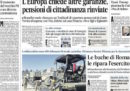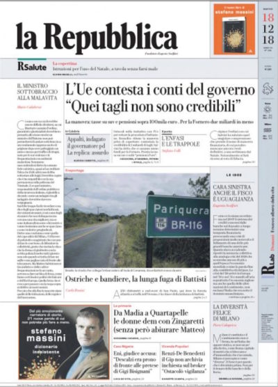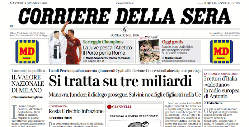 Nonostante l’accordo raggiunto domenica notte tra Lega e Movimento 5 Stelle sulla riduzione del deficit nella prossima legge di bilancio, le prime pagine dei giornali di oggi dicono che la trattativa con l’Unione Europea per evitare l’apertura di una procedura di infrazione è ancora aperta e che tutto sarà deciso mercoledì. C’è poi spazio per la storia dei debiti della società di famiglia di Alessandro Di Battista, gravemente indebitata con alcuni suoi dipendenti: circolava da ieri sui giornali online, oggi è anche sulla prima pagina del Giornale e del Dubbio. Si trovano ancora sporadici titoli sulla latitanza di Cesare Battisti, per cui il presidente del Brasile ha firmato l’ordine di estradizione in Italia, e si parla delle prossime avversarie delle squadre di calcio italiane nelle coppe europee, dopo i sorteggi di ieri.