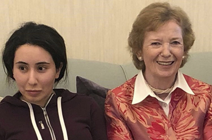Latifa bint Mohammed al Maktoum e Mary Robinson in una foto che sarebbe stata scattata a Dubai il 15 dicembre 2018 e che è stata pubblicata il 24 dicembre (United Arab Emirates Ministry of Foreign Affairs and International Cooperation via AP)