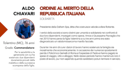 Il 29 dicembre il presidente della Repubblica Sergio Mattarella ha conferito più di trenta onorificenze al Merito della Repubblica Italiana «a cittadine e cittadini che si sono distinti per atti di eroismo, per l’impegno nella solidarietà, nel soccorso, per l’attività in favore dell’inclusione sociale, nella cooperazione internazionale, nella tutela dei minori, nella promozione della cultura e della legalità». Sono importanti riconoscimenti da parte dello Stato che vengono assegnati su iniziativa del presidente della Repubblica per premiare persone e iniziative che giudica lodevoli.