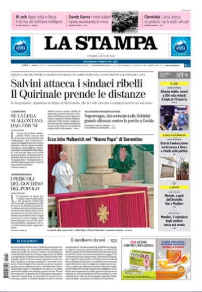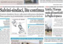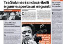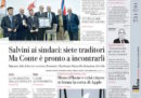 Sui giornali di oggi si parla ancora della protesta dei sindaci contro il decreto sicurezza, con eloquenti virgolettati del ministro dell’Interno Matteo Salvini – che li chiama “traditori” – e la notizia di qualche apertura nei loro confronti da parte del presidente del Consiglio Giuseppe Conte. Un’altra notizia che trova diverso spazio sulle prime pagine è quella dell’ambasciatore nordcoreano a Roma che ieri ha disertato, poi ci sono foto di John Malkovich vestito da Papa, un’intervista al nuovo direttore di Rai Due Carlo Freccero e ancora molto calciomercato (sarà così per un po’).