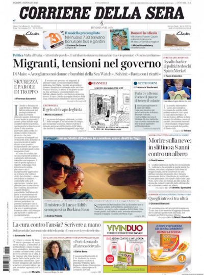 Quasi tutte le prime pagine dei giornali sono occupate dalla polemica sulle due navi delle ong con a bordo 49 migranti bloccate da giorni al largo di Malta. C’è spazio per poco altro: il Sole 24 Ore, per esempio, ha scelto di aprire coi dati dell’occupazione negli Stati Uniti. I giornali sportivi si occupano soprattutto delle trattative dei primi giorni del calciomercato invernale.
