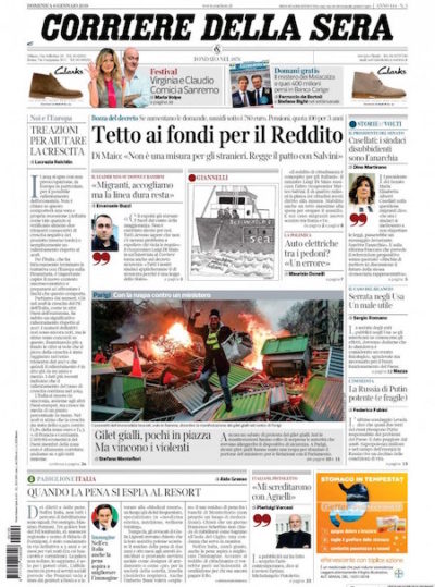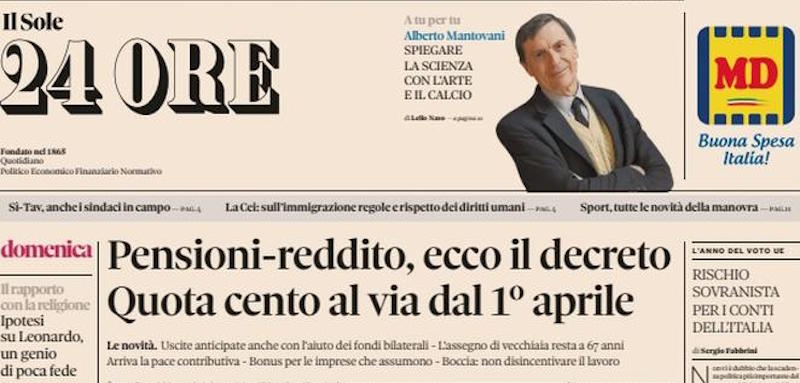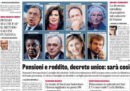 Stamattina i principali quotidiani aprono quasi tutti con le bozze dei decreti che istituiranno il cosiddetto “reddito di cittadinanza” e la “quota 100” per le pensioni, che dovrebbero essere presentati nei prossimi giorni. Il Fatto Quotidiano mette invece in prima pagina un’inchiesta su Malta e i migranti. I giornali sportivi si concentrano sul calciomercato, come al solito in questo periodo.