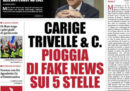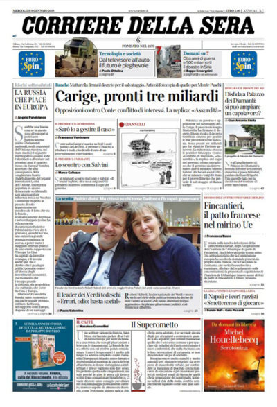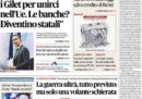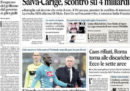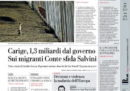 La maggior parte dei giornali di oggi si occupa in apertura del decreto del governo per il salvataggio della banca Carige, con i dubbi sui costi complessivi dell’operazione e le accuse delle opposizioni al presidente del Consiglio Conte di avere un conflitto di interessi sulla banca. La Stampa apre invece con un’intervista al presidente dell’INPS Boeri critico sulla manovra economica, Avvenire e la Nazione seguono la vicenda dei migranti bloccati su due navi nelle acque maltesi, il Fatto intervista il leader del Movimento 5 Stelle Di Maio sui rapporti con i gilet gialli, e Libero continua la sua campagna contro il reddito di cittadinanza.