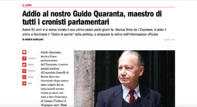 Il 10 gennaio è morto il giornalista Guido Quaranta, storico cronista parlamentare del settimanale L’Espresso. Aveva 91 anni. Quaranta era nato a San Francesco al Campo (Torino) il 18 giugno 1927 ed era ricoverato dallo scorso 7 gennaio all’ospedale Gemelli di Roma in seguito a un ictus. Aveva iniziato la sua carriera di cronista parlamentare nel 1959 a Paese Sera, dove rimase per dieci anni per poi passare prima a Panorama e poi a L’Espresso. Nell’articolo scritto in suo ricordo dall’attuale direttore dell’Espresso, Marco Damilano, Quaranta viene descritto come un maestro nel raccontare i retroscena del Parlamento, grazie alla sua capacità di dare voce «anche ai militi ignoti del Transatlantico, i deputati comuni, i peones immancabilmente calpestati dalla volontà delle segreterie che li sovrastano, eppure pronti a colpire per certificare la loro esistenza».