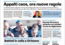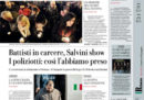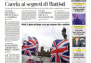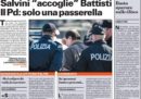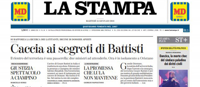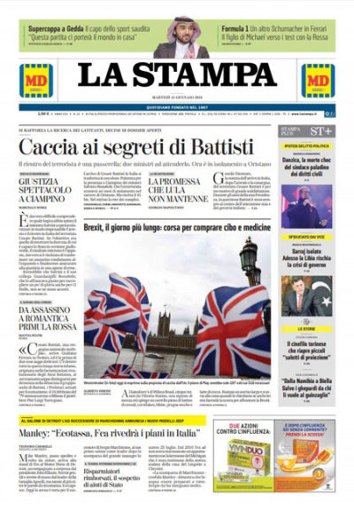 La maggior parte dei giornali di oggi titola sull’arrivo in Italia dell’ex terrorista Cesare Battisti dopo l’arresto in Bolivia, sul suo trasferimento al carcere di Oristano, e sull’accoglienza all’arrivo all’aeroporto di Ciampino, con la presenza dei ministri Bonafede e Salvini. Repubblica apre invece sull’uccisione del sindaco di Danzica, accoltellato domenica sera durante un evento di beneficenza, mentre il Manifesto si occupa della condanna a 18 mesi di Roberto Calderoli per gli insulti razzisti all’ex ministro Cécile Kyenge.