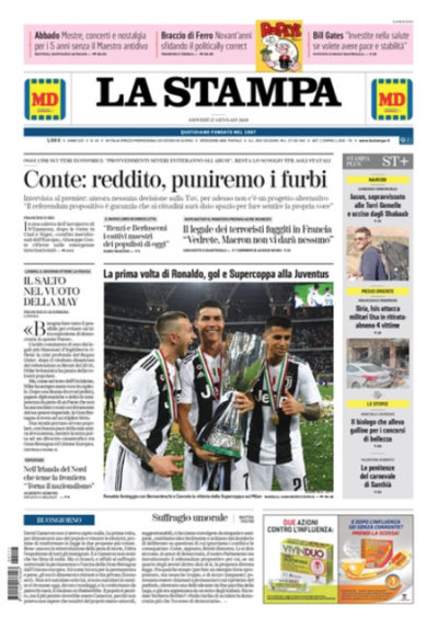 Ci sono notizie diverse in apertura sui principali quotidiani di oggi: alcuni si occupano della situazione del governo, nel quale sembra ci siano opinioni diverse sull’approvazione del reddito di cittadinanza e della riforma delle pensioni, e su come migliorare la situazione dei conti pubblici (e la Stampa intervista il presidente del Consiglio Conte). Il Corriere della Sera e il Sole 24 Ore aprono sulla fiducia votata dal Parlamento britannico al primo ministro Theresa May il giorno dopo la bocciatura dell’accordo con l’Unione Europea su Brexit, il Manifesto titola sul video del ministro della Giustizia Bonafede sull’arresto di Cesare Battisti, e i giornali sportivi commentano la vittoria nella Supercoppa italiana della Juventus, che ha battuto 1-0 il Milan con un gol di Cristiano Ronaldo.