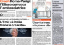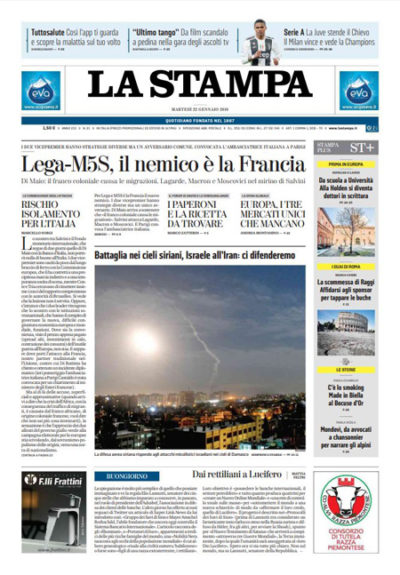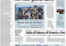 La maggior parte dei giornali di oggi si occupa in apertura delle tensioni fra Italia e Francia, con la convocazione dell’ambasciatore italiano da parte del presidente francese Macron dopo le accuse alla Francia dei leader del Movimento 5 Stelle Di Maio e Di Battista per le politiche in Africa che favorirebbero l’arrivo di migranti in Italia. Il Corriere della Sera e il Sole 24 Ore aprono invece sulle preoccupazioni del direttore del Fondo Monetario Internazionale Lagarde per il rallentamento dell’economia in Italia, il Giornale commenta il calo del Movimento 5 Stelle nelle elezioni suppletive per la Camera in Sardegna, e i giornali sportivi titolano sulle vittorie di Milan e Juventus nei due posticipi di campionato giocati ieri.