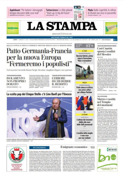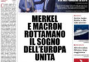 Ci sono notizie diverse in apertura sui giornali di oggi: alcuni titolano sulla decisione della Germania di abbandonare la missione militare Sophia per controllare i viaggi di migranti nel Mediterraneo a causa della linea dura dell’Italia sull’accoglienza, altri aprono sull’accordo fra Francia e Germania per contrastare le forze populiste in Europa. Repubblica e il Dubbio si occupano dello sgombero del centro per i migranti di Castelnuovo di Porto, vicino a Roma, il Giornale critica il reddito di cittadinanza, mentre i giornali sportivi titolano sull’acquisto dell’attaccante polacco Piątek da parte del Milan.