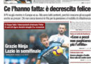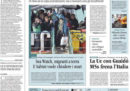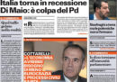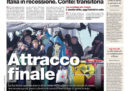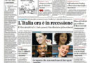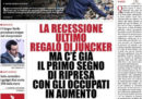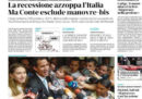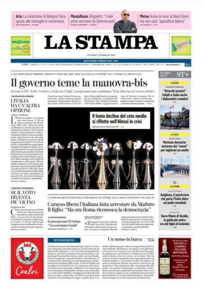 Quasi tutti i giornali di oggi aprono sui dati diffusi dall’ISTAT ieri, e anticipati l’altro ieri dal presidente del Consiglio Conte, che confermano il calo dello 0,2% del PIL e certificano la recessione per l’Italia. Il Manifesto si occupa dello sbarco a Catania dei 47 migranti bloccati da giorni a bordo della nave Sea Watch 3, il Corriere della Sera e il Giornale titolano sul voto del Parlamento Europeo su una mozione che riconosce il leader dell’opposizione Guaidó come legittimo presidente del Venezuela, voto sul quale il Movimento 5 Stelle e la Lega si sono astenuti. I giornali sportivi aprono sulla vittoria ai rigori sull’Inter della Lazio, che si qualifica per le semifinali di coppa Italia.