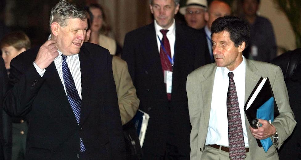 L’assistente del segretario di Stato americano James Kelly, a sinistra, insieme all’inviato speciale del governo per i cosiddetti “six-party talks” sul programma nucleare nordcoreano. Pechino, 26 giugno 2004 (AP Photo/Greg Baker)