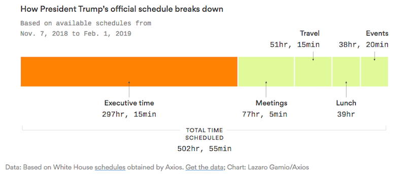 Axios ha calcolato che dal 7 novembre all’1 febbraio, Trump ha passato 297 ore e 15 minuti di executive time, sei volte tanto il tempo che ha passato in viaggio e quasi quattro volte tanto quello che ha impegnato in incontri e riunioni. La tabella pubblicata da Axios non include tutti gli impegni lavorativi di Trump – per esempio ne sono escluse le riunioni organizzate all’ultimo minuto, e solitamente ce ne sono un paio al giorno – ma aiutano a farsi un’idea di come Trump passi il tempo.