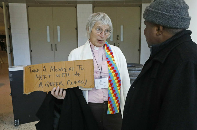 Alyss Swanson, diacono metodista transgender di San Jose, California, parla con il vescovo Samuel Quire, dalla Liberia, durante la Conferenza generale della Chiesa Metodista Unita, St. Louis, 25 febbraio 2019 (J.B. Forbes/St. Louis Post-Dispatch via AP)