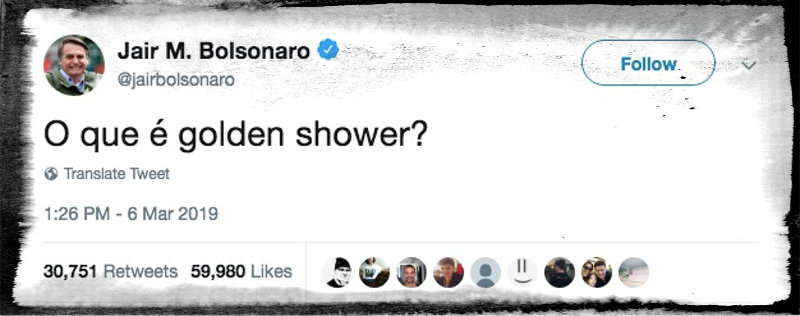 Bolsonaro ha quasi 3,5 milioni di follower su Twitter, e il video è stato retwittato 8.500 volte. All’inizio il video era mostrato senza avvertimenti, ma dopo qualche ora Twitter ha introdotto un messaggio per avvisare del contenuto esplicito. Nelle ore successive Bolsonaro ha twittato altre cose totalmente scollegate, ma poi mercoledì pomeriggio ha scritto: «Cos’è una pioggia dorata?». In molti – che si erano persi il pezzo precedente – avevano pensato fosse un riferimento alla famosa storia del presidente statunitense Donald Trump: in un dossier di intelligence mai verificato, infatti, si diceva che in un albergo di Mosca Trump avesse chiesto a delle prostitute di urinarsi addosso (la pratica sessuale che per l’appunto viene chiamata “pioggia dorata”). Probabilmente, hanno invece ipotizzato in molti, era un tentativo – autentico o meno – di chiedere spiegazioni sulle risposte ricevute al suo precedente tweet.