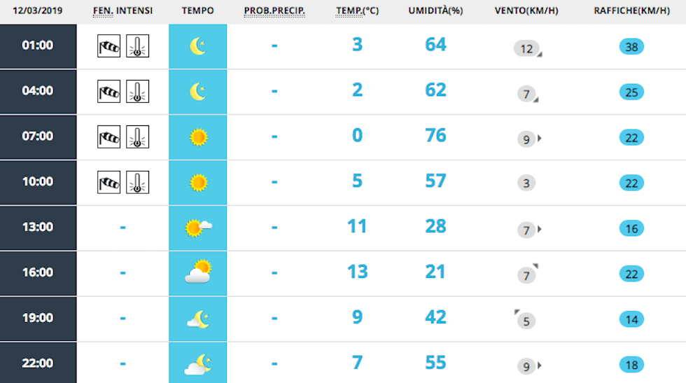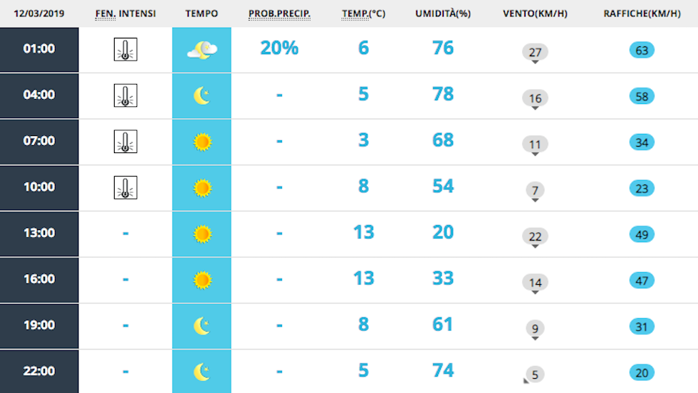 Il 12 marzo a Milano sarà una giornata soleggiata, con qualche nuvola che arriverà solo nel tardo pomeriggio. Sarà però anche una giornata piuttosto ventosa, specialmente al mattino, e questo farà abbassare molto le temperature per l’ora in cui in molti usciranno di casa per andare a scuola o al lavoro (sono previsti 0 gradi alle 7 del mattino). Il vento dovrebbe calare già durante la mattinata e le temperature saliranno fino a 13 gradi.