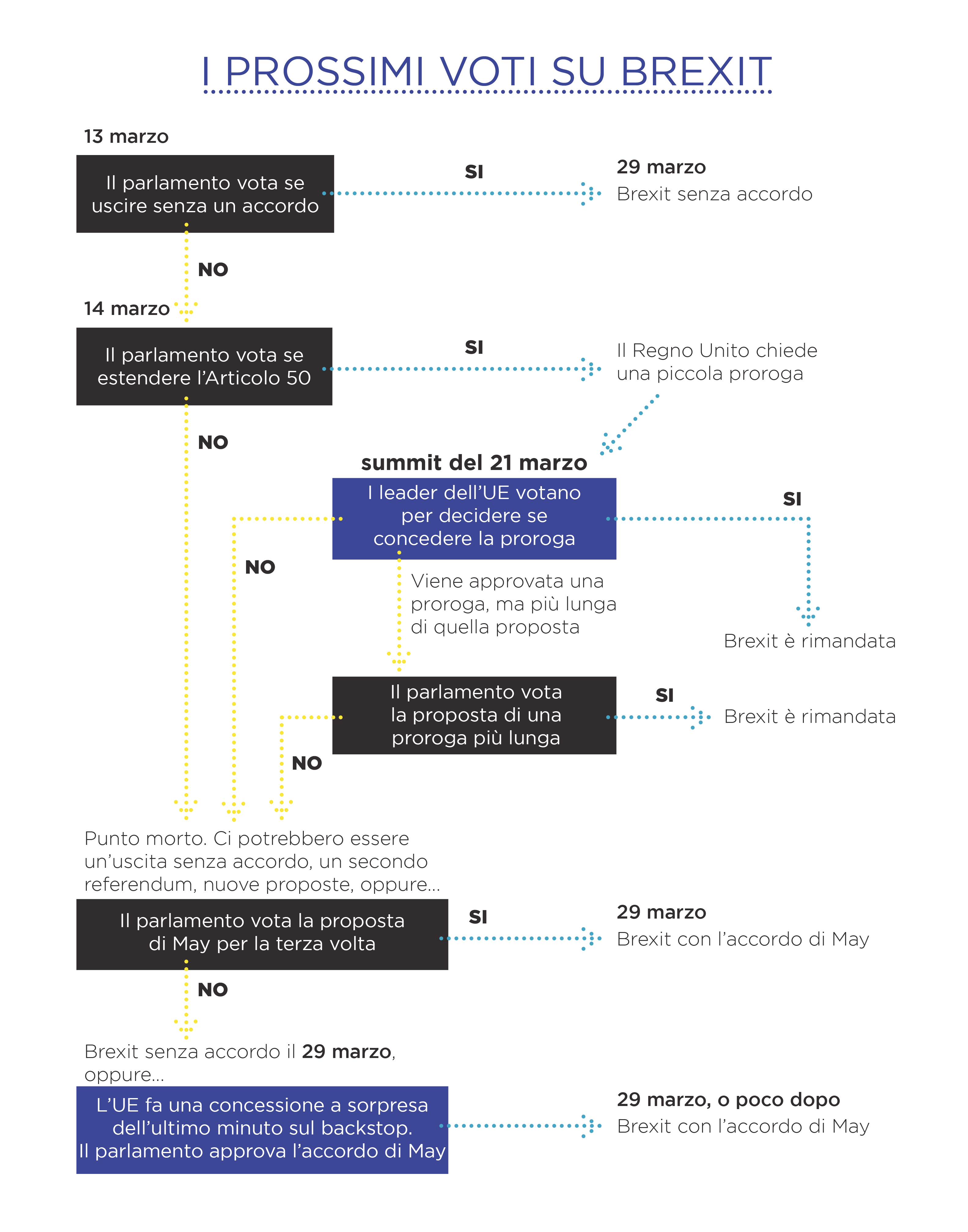 Se il “no deal” dovesse essere escluso – scenario più probabile – il Parlamento dovrà ritrovarsi ancora giovedì per votare una eventuale proroga dell’Articolo 50 del Trattato di Lisbona, per spostare più avanti la data fissata per Brexit. Al riguardo, il portavoce del presidente del Consiglio europeo Donald Tusk ha detto che il Regno Unito dovrà motivare la richiesta di proroga: «I 27 membri dell’Unione Europea si aspettano di ricevere una giustificazione credibile per una possibile estensione, con indicata la durata». In altre parole, il governo dovrà tornare a Bruxelles con una proposta e non potrà limitarsi semplicemente a chiedere altro tempo senza una ragione precisa.