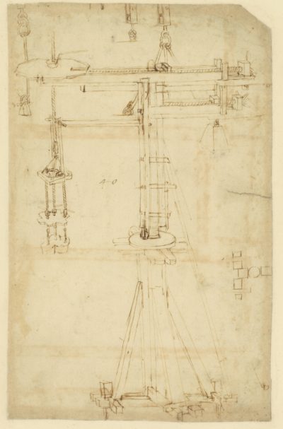 La prima sala è dedicata alla formazione ingegneristica di Leonardo in Toscana e in particolare alle gru progettate da Filippo Brunelleschi per realizzare la cupola del Duomo di Firenze. Come allievo della bottega di Verrocchio, tra il 1469 e il 1471, Leonardo lavorò nel cantiere e imparò le tecniche messe insieme dagli ingegneri-artisti rinascimentali partendo dalle tradizioni medievali: negli anni si specializzò nel disegnare in modo nuovo e dettagliato proprio queste tecniche. All’altra importante fonte della formazione di Leonardo – l’architettura classica – è invece dedicata la seconda sala della mostra, in cui tra le altre cose è esposto l’unico libro proveniente dalla biblioteca di Leonardo che ci sia rimasto. È una copia del Trattato di architettura civile e militare di Francesco di Giorgio Martini e contiene note manoscritte di Leonardo: è uno dei testi che studiò per realizzare il famoso Uomo Vitruviano, il disegno che rappresenta le proporzioni ideali del corpo umano.