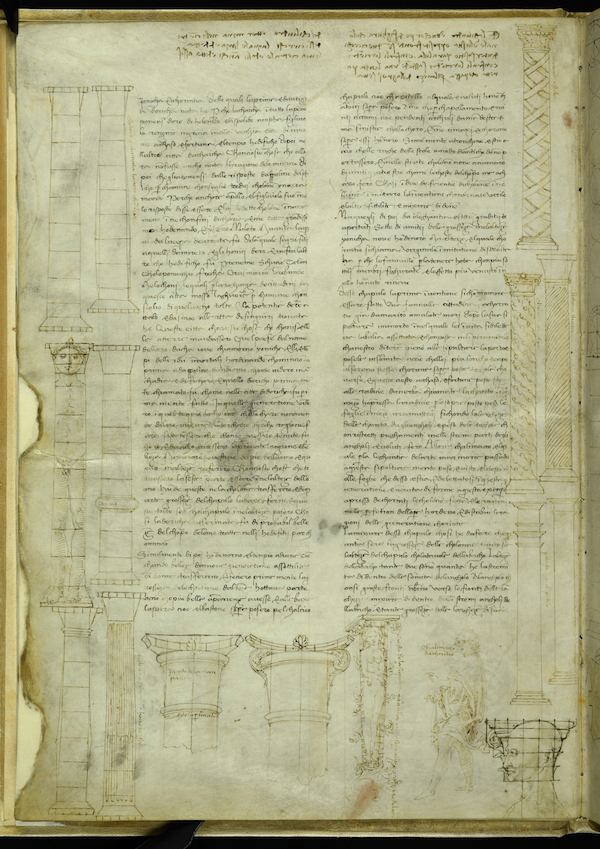 Francesco di Giorgio Martini, dal “Trattato di architettura civile e militare” : schizzi di colonne, capitelli e proporzioni della testa umana, con note autografe di Leonardo, 1480-1482 circa (©Biblioteca Medicea Laurenziana; su concessione del Ministero per i Beni e le Attività Culturali-Biblioteca Nazionale Marciana)