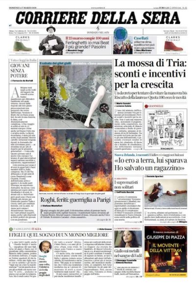 Sulle prime pagine delle edizioni domenicali dei maggiori quotidiani italiani viene dato spazio soprattutto alle foto degli scontri tra polizia e manifestanti a Parigi, nei quali sono state arrestate almeno 240 persone, e agli sviluppi dell’attentato di venerdì a Christchurch, in Nuova Zelanda. Si trovano anche le ultime ricostruzioni sulla morte di Imane Fadil, una delle testimoni nel processo “Ruby Ter”, quello sulla presunta compravendita di testimonianze fatta da Silvio Berlusconi. Al riguardo, Berlusconi ha detto di non aver mai conosciuto la ragazza. Infine, spazio alle presentazioni del “derby” di Milano, in programma stasera allo stadio Giuseppe Meazza.