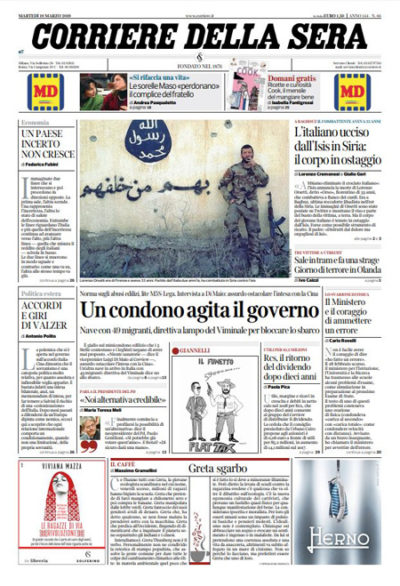 Ci sono notizie diverse in apertura sui giornali di oggi: le divisioni nel governo sulla flat tax proposta dalla Lega, il salvataggio da parte della nave di una ONG italiana di 49 migranti nel Mediterraneo e l’intenzione del ministro dell’Interno Salvini di chiudere i porti italiani per bloccare lo sbarco, l’uccisione da parte dell’ISIS di un italiano che combatteva al fianco dei curdi in Siria, le indagini sulla morte della testimone del processo “Ruby Ter” Imane Fadil, e il congresso delle famiglie di Verona in programma la prossima settimana.