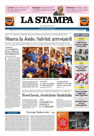 Per tutti i giornali di oggi la notizia in apertura riguarda la nave Mare Jonio della ong italiana Mediterranea, arrivata ieri a Lampedusa dove ha sbarcato i 49 migranti che aveva raccolto al largo delle coste della Libia ed è stata messa sotto sequestro dalla Guardia di Finanza, e la richiesta del ministro dell’Interno Salvini che vengano arrestati i componenti dell’equipaggio. Fanno eccezione il Corriere della Sera, che apre con un articolo del presidente cinese Xi Jinping alla vigilia della sua visita in Italia, e il Fatto, che segue ancora la vicenda della morte di Imane Fadil, mentre il Sole 24 Ore e il Tempo titolano sulla sentenza del tribunale dell’Unione Europea sugli interventi dello Stato per il salvataggio delle banche in difficoltà.