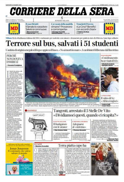 La maggior parte dei giornali di oggi si occupa in apertura dell’incendio a San Donato Milanese dell’autobus con a bordo 51 bambini, che è stato dirottato e incendiato dall’autista sembra per protestare contro le morti di migranti nel Mediterraneo. L’altra notizia del giorno, sulla quale titolano diversi giornali soprattutto romani, è l’arresto del presidente del consiglio comunale di Roma e dirigente del Movimento 5 Stelle Marcello De Vito con l’accusa di corruzione per la costruzione del nuovo stadio della Roma. I giornali sportivi si occupano dell’accordo fra l’Inter e Icardi, che da oggi torna a allenarsi con la squadra.