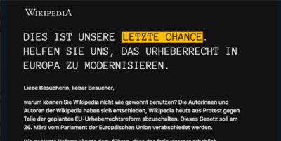Giovedì 21 marzo Wikipedia è stata oscurata in Germania, Repubblica Ceca, Slovacchia e Danimarca per protesta contro la riforma europea del copyright, che dovrebbe essere approvata definitivamente il prossimo 26 marzo dal Parlamento Europeo.