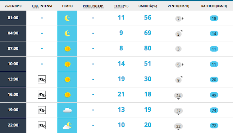 Sarà una bella giornata di sole, con alte temperature: all’ora di pranzo sono previsti 19 °C e alle 16 saliranno a 21 °C: potete tirare fuori la giacca di jeans.