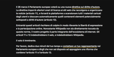 Wikipedia Italia invita poi gli utenti a contattare un proprio rappresentante nel Parlamento europeo per fargli sapere di non essere «disposto ad appoggiare una riforma che contiene l’articolo 11 e l’articolo 13». Sempre per lo stesso motivo il 21 marzo erano state oscurate le pagine di Wikipedia in Germania, Repubblica Ceca, Slovacchia e Danimarca.