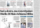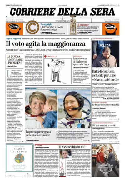 I giornali di oggi per la notizia di apertura fanno scelte diverse: alcuni si occupano dei risultati delle elezioni regionali in Basilicata e delle possibili conseguenze sull’alleanza di governo fra Lega e Movimento 5 Stelle, altri titolano sull’ammissione in un interrogatorio da parte di Cesare Battisti di aver commesso gli omicidi per i quali era stato condannato. Repubblica apre invece sull’aumento del debito pubblico durante il governo Conte, la Stampa segue il voto di oggi al Parlamento europeo sulla nuova direttiva sul diritto d’autore, il Manifesto e la Nazione titolano sulle perplessità del ministro dell’Interno Salvini riguardo alla concessione della cittadinanza italiana al ragazzo protagonista del salvataggio sull’autobus a San Donato Milanese, e Avvenire si preoccupa dell’aumento delle emissioni di CO2 nel 2018.