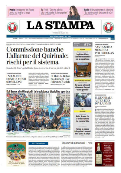 Le due notizie principali in apertura sui giornali di oggi sono le perplessità del presidente della Repubblica Mattarella sui poteri della commissione parlamentare d’inchiesta sulle banche e l’approvazione definitiva al Senato della nuova legge sulla legittima difesa. Il Manifesto apre invece sul congresso delle famiglie che inizia oggi a Verona, il Giornale si occupa delle ipotesi sulle future alleanze della Lega, e Avvenire presenta una sua ricerca sui comportamenti positivi nelle città italiane.