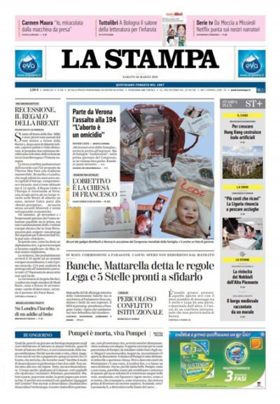 Ci sono notizie diverse in apertura sui quotidiani di oggi: alcuni si occupano della firma del presidente della Repubblica Mattarella sulla legge che istituisce la commissione parlamentare d’inchiesta sulle banche, accompagnata da una lettera ai presidenti di Camera e Senato per porre dei limiti alla sua azione, altri titolano sull’apertura del congresso delle famiglie a Verona e della contro manifestazione in programma oggi. Repubblica apre invece sulla nuova bocciatura da parte del Parlamento britannico della proposta del primo ministro May su Brexit, il Giornale si preoccupa dei costi delle pensioni degli immigrati, mentre i giornali sportivi presentano il weekend del campionato di serie A.
