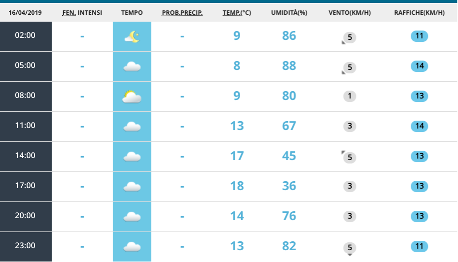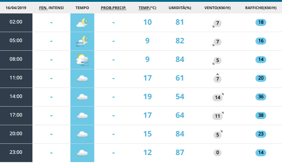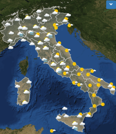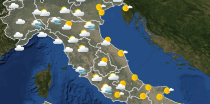 Le previsioni meteo per martedì sono leggermente migliori di quelle dei giorni scorsi, è prevista pioggia solo in alcune zone costiere di Puglia e Calabria, mentre nel resto della Penisola sarà al massimo nuvoloso, soprattutto al Centro e al Nord dove i cieli saranno sostanzialmente coperti per tutto il giorno, ma dove non dovrebbe più piovere. Le temperature massime saranno sotto i venti gradi.