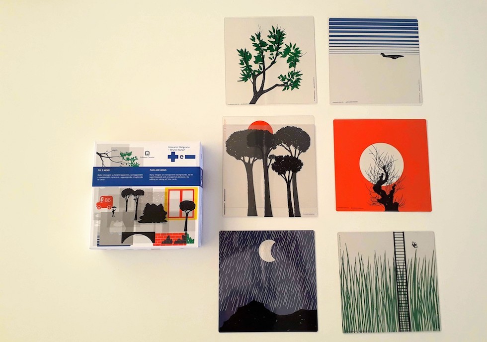Più e meno è un gioco che Munari creò nel 1970 insieme a Giovanni Belgrano. È composto da 72 grandi carte, 42 delle quali sono stampate su sfondi trasparenti che potete comporre e sovrapporre, aggiungere o togliere sulla base della storia che volete raccontare, dell’immagine volete creare. È pensato sia per i bambini sia per gli adulti (questo è quello che è successo su una delle scrivanie della redazione quando è stata aperta la confezione).