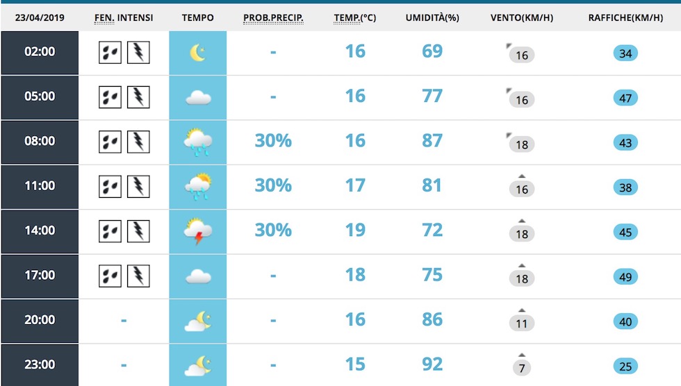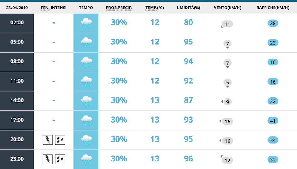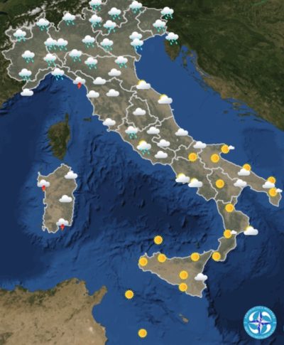 Per domani, martedì 23 aprile, è prevista pioggia al nord e un po’ anche al centro e al sud, quasi dappertutto, in breve. Più nello specifico, di mattina il cielo sulla pianura Padana sarò molto nuvoloso, con qualche piovasco sulle regioni occidentali e l’Emilia-Romagna, mentre in serata si metterà a piovere in gran parte del nord e a nevicare sulle Alpi occidentali, sopra i 1.500 metri di altitudine. Pioverà anche in Sardegna e, in serata, anche nel centro Italia, prima sul versante tirrenico e poi altrove. Al sud ci sarà qualche temporale diffuso nel pomeriggio, ma nella tarda serata le condizioni miglioreranno.