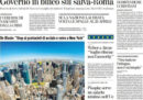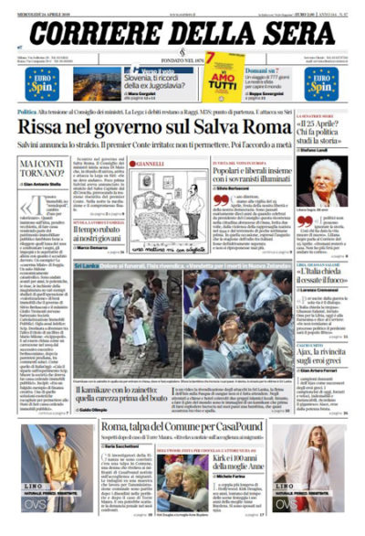 È uno di quei giorni da titoli apocalittici sul governo: si susseguono le risse, i caos, le guerre eccetera. C’entra la cosiddetta norma “salva-Roma”. I bisticci nella maggioranza occupano la maggior parte dello spazio sulle prime pagine nazionali, e sono pochi i quotidiani a dedicare ancora un titolo agli attentati di Pasqua in Sri Lanka. Nello sport, si parla della semifinale di ritorno di Coppa Italia tra Milan e Lazio.