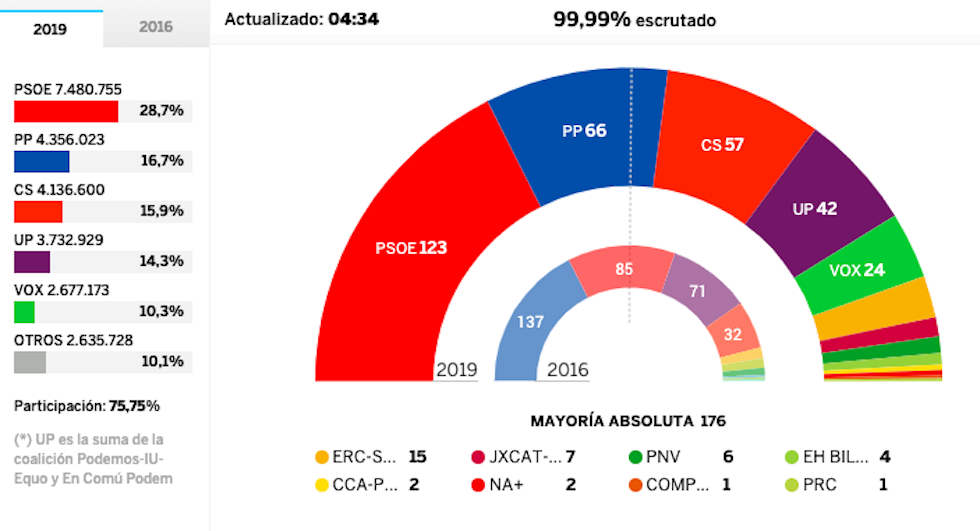 Domenica si sono tenute elezioni anticipate in Spagna, convocate dal primo ministro uscente Pedro Sánchez, del Partito Socialista (PSOE), il principale partito di sinistra spagnolo. I risultati definitivi del voto sono già stati diffusi e sono rilevanti e sorprendenti per diverse ragioni, tra le altre perché sono molto diversi da quelli emersi dalle elezioni del 2016. In poche parole, si può dire che la sinistra è andata molto meglio della destra, che il vero vincitore è stato il PSOE di Sánchez, e che per la prima volta dal ritorno alla democrazia in Spagna un partito di estrema destra è entrato in Parlamento.