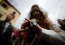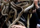 Mercoledì primo maggio si è tenuta come ogni anno la “Festa dei serpari” di Cocullo, un paese di poche centinaia di abitanti in provincia dell’Aquila, in Abruzzo. La festa è in onore del patrono della città, san Domenico abate, e consiste nel ricoprire la statua che lo raffigura con dei serpenti, e poi sfilare in una processione. L’origine di questa usanza sarebbe collegata a un episodio miracoloso dell’undicesimo secolo, in cui il santo estirpò dei serpenti dai campi dei contadini.