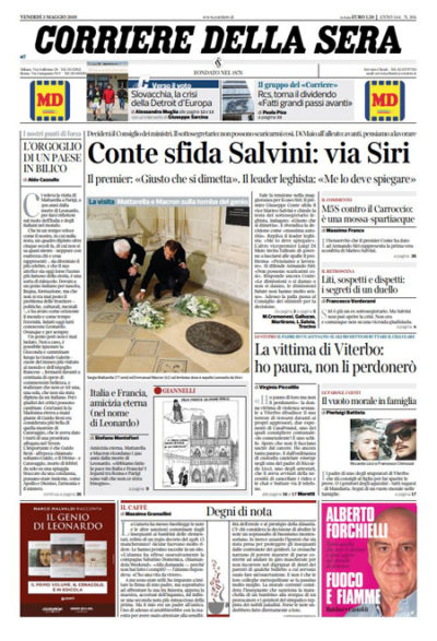 Tutti i giornali di oggi titolano sull’annuncio di ieri del presidente del Consiglio Conte di voler chiedere nel prossimo Consiglio dei ministri la revoca dell’incarico del sottosegretario leghista Siri, sotto indagine per corruzione. Il Sole 24 Ore apre invece sui dati delle vendite di automobili in aprile, di nuovo in crescita dopo un lungo periodo negativo, mentre i giornali sportivi presentano il derby di stasera fra Juventus e Torino.