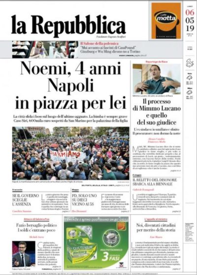 È uno di quei giorni in cui le prime pagine dei quotidiani vanno in ordine sparso: la Repubblica apre con Napoli, il Corriere con Gaza e Israele, la Stampa con le parole del cancelliere dell’Austria sull’Italia. In mezzo qualcuno si occupa molto poco seriamente del meteo, altri di Armando Siri, altri ancora ovviamente della Serie A, dato che oggi è lunedì.