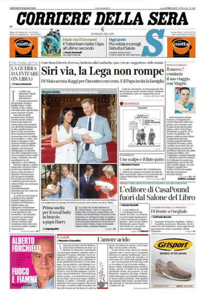 Ci sono notizie diverse in apertura sui quotidiani di oggi: alcuni si occupano della revoca dell’incarico al sottosegretario leghista Siri, decisa ieri dal Consiglio dei ministri, altri titolano sulla visita del sindaco di Roma Raggi alla famiglia rom alla quale è stato assegnato un alloggio popolare nel quartiere di Casal Bruciato fra le contestazioni dei militanti di CasaPound. Altri giornali seguono le notizie sull’inchiesta per corruzione in Lombardia nella quale è indagato anche il presidente della Regione Fontana, la Stampa apre sull’esclusione dell’editore Altaforte dal Salone del Libro di Torino, e Avvenire commenta la sentenza della Cassazione sul riconoscimento dei figli avuti tramite la maternità surrogata.