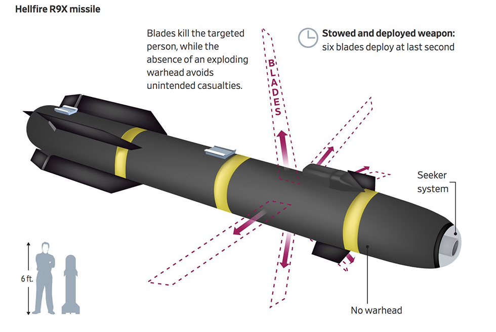 Il razzo si chiama R9X ed è una variante del missile Hellfire introdotto come arma anticarro negli anni Ottanta e utilizzato sui droni dopo l’11 settembre 2001 per colpire le persone. L’R9X è però equipaggiato con una testata inattiva. Invece di esplodere, è stato progettato per cadere con tutto il suo peso sui vari bersagli, automobili o edifici, senza danneggiare persone e proprietà vicine: per chi è preso di mira è come se un’incudine cadesse dal cielo ad alta velocità, hanno detto i funzionari al Wall Street Journal. Il razzo è dotato anche di un equipaggiamento speciale: sei lunghe lame interne che escono pochi secondi prima dell’impatto per distruggere qualsiasi cosa si ritrovi lungo il suo percorso e poi il bersaglio stesso.