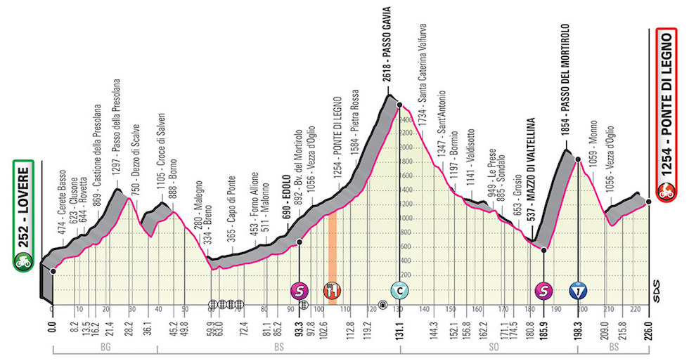 L’edizione 102 del Giro avrà molti chilometri a cronometro (quasi sessanta) ma anche tante salite. I gran premi della montagna saranno 40, con cinque arrivi in salita e cinque tappe di alta montagna. La Cima Coppi, la vetta più alta, sarà il Passo Gavia, a 2.618 metri sul livello del mare. La Montagna Pantani, quella considerata più ostica, sarà il Mortirolo: è lunga 12 chilometri e ha una pendenza media del 12 per cento. Le salite di Gavia e Mortirolo saranno affrontate il 28 maggio, nella 19ª tappa: lunga 226 chilometri e con oltre 5mila metri di dislivello. È la tappa più dura, che il sito Inner Ring definisce “un’antologia alpina“, ma – come mostra la planimetria generale – ce ne saranno diverse altre poco prima e poco dopo. Il meteo, la classifica e le evoluzioni della gara potrebbero rendere difficilissime e decisive anche altre tappe.