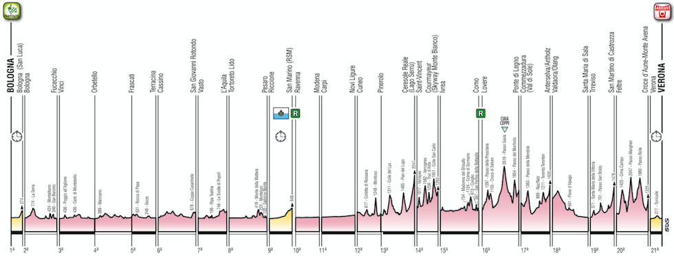 Dopo San Marino ci saranno un paio di tappe pianeggianti in cui la carovana del Giro si sposterà verso la Liguria. Poi, dal 23 maggio in poi, inizieranno le vere salite. Partendo dal Piemonte il Giro percorrerà da ovest a est tutto l’arco alpino, fino ad arrivare a Verona, dove finirà con la terza cronometro individuale, lunga 15 chilometri e anche quella con un po’ di salita. Per capire come sarà la seconda metà del Giro basta guardare l’altimetria generale: