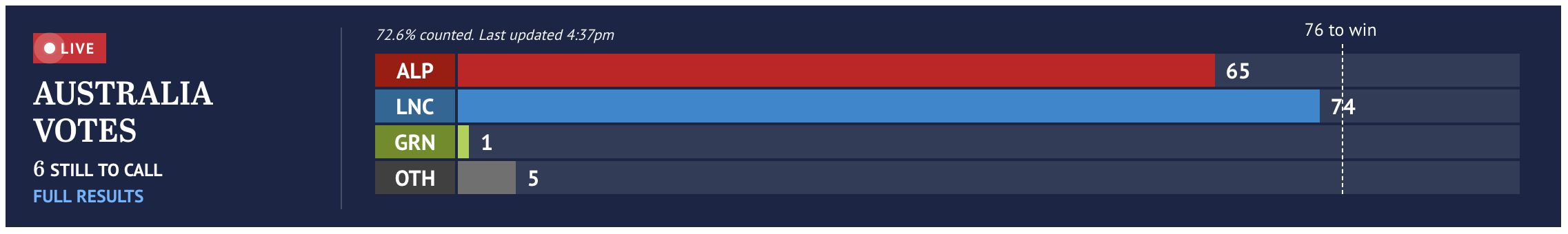 La coalizione conservatrice che governa in Australia ha vinto le elezioni parlamentari di oggi, ottenendo il maggior numero dei seggi e probabilmente confermando il risultato delle scorse elezioni. È una notizia, tanto che il primo ministro uscente – Scott Morrison, del Partito Liberale di centrodestra – ha parlato di «miracolo»: fino a poco tempo fa il Partito Laburista era dato in ampio vantaggio, e anche i sondaggi degli ultimi giorni lo davano per lievemente favorito. Il capo del Partito Laburista, Bill Shorten, sconfitto anche alle elezioni del 2016, ha ammesso la sconfitta. Non è ancora chiaro se la coalizione conservatrice riuscirà a raggiungere i 76 seggi o dovrà stringere altre alleanze o formare un governo di minoranza, ma è praticamente certo che Morrison sarà ancora primo ministro.