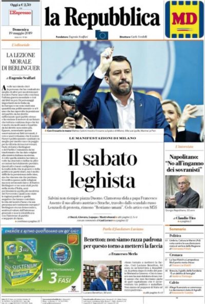 I titoli dei giornali di oggi riflettono inevitabilmente le due principali notizie di ieri: la manifestazione della Lega e di molti partiti europei di estrema destra che si è tenuta a Milano, e l’imbarazzo della Lega e di molti partiti europei di estrema destra per quanto successo in Austria, dove il leader della destra locale – e vicecancelliere – si è dimesso, portando il paese a nuove elezioni, dopo che è venuto fuori dei favori che aveva promesso alla Russia in cambio di finanziamenti e sostegno. Il tutto mentre mancano una settimana esatta alle elezioni europee, e una alla fine del campionato di Serie A.