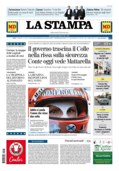 La discussione sul nuovo decreto sicurezza, la morte di Niki Lauda, e il film di Tarantino a Cannes