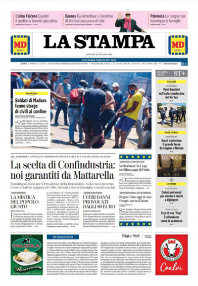 Le solite discussioni nel governo fra Lega e Movimento 5 Stelle, che non riescono a trovare un accordo sui decreti sulla sicurezza, voluto dal ministro dell’Interno Salvini, e sulla famiglia, proposto dal ministro dello Sviluppo economico Di Maio, sono in apertura su molti giornali di oggi, insieme all’incontro fra il presidente del Consiglio Conte e il presidente della Repubblica Mattarella, che chiede garanzie sui conti pubblici. La Stampa apre invece sulla situazione in Venezuela, il Manifesto e il Sole 24 Ore titolano sull’assemblea di Confindustria, Avvenire e il Giornale di Sicilia ricordano la strage di Capaci in cui morirono Giovanni Falcone e gli uomini della sua scorta nel ventisettesimo anniversario, e il Fatto si occupa dei candidati “impresentabili” alle prossime elezioni europee.